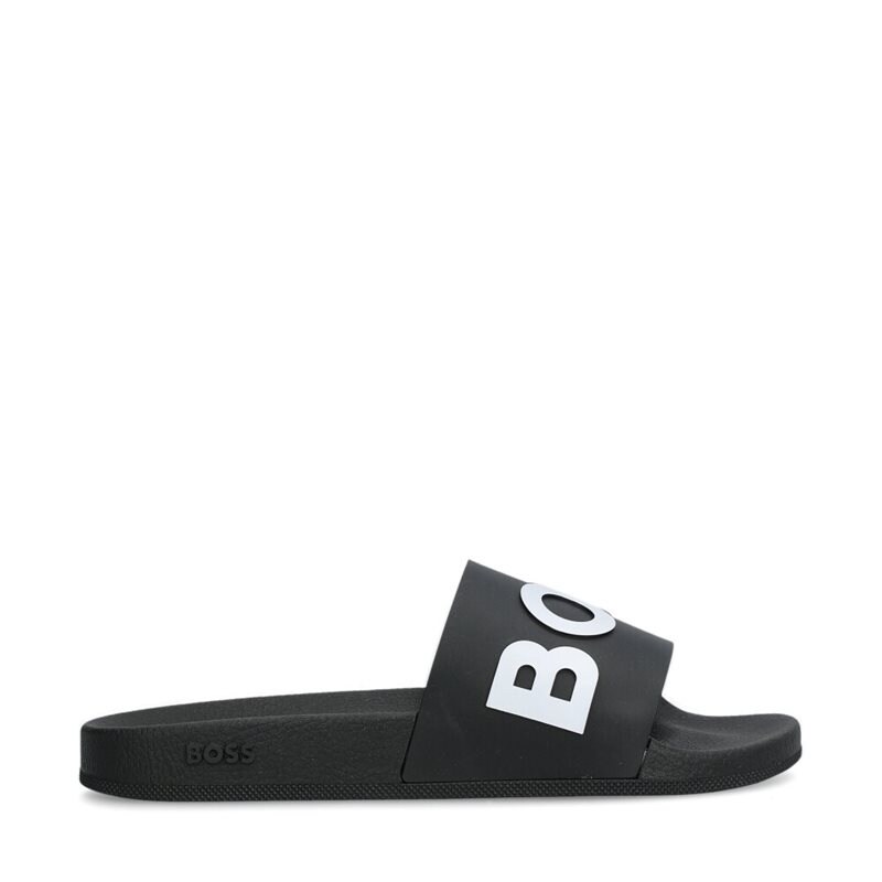 Bay, svarta sandaler från Hugo Boss med formad sula och brett logoband över foten. De perfekta pool- och beachsandalerna.