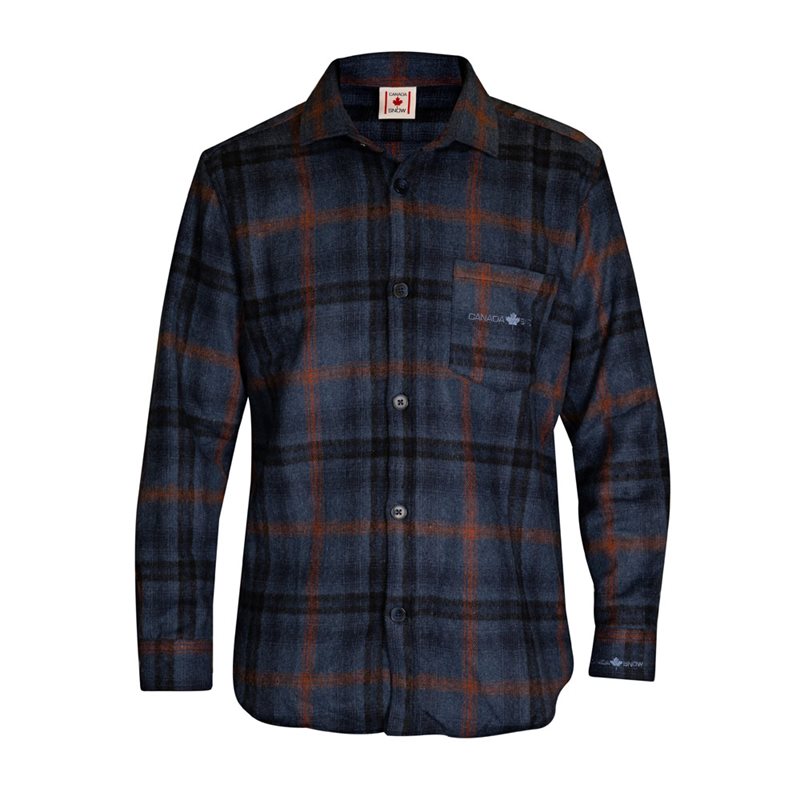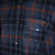 Cam, flanellskjorta från Canada Snow i mörka fina färger. Marinblå med mörkare samt tegelröda ränder. Broderad logo i ljusblått på bröstfickan och i längst upp i nacken. Något små i stl, välj gärna en större storlek. 60% bomull, 40% Akryl. Tvätt 30 grader.