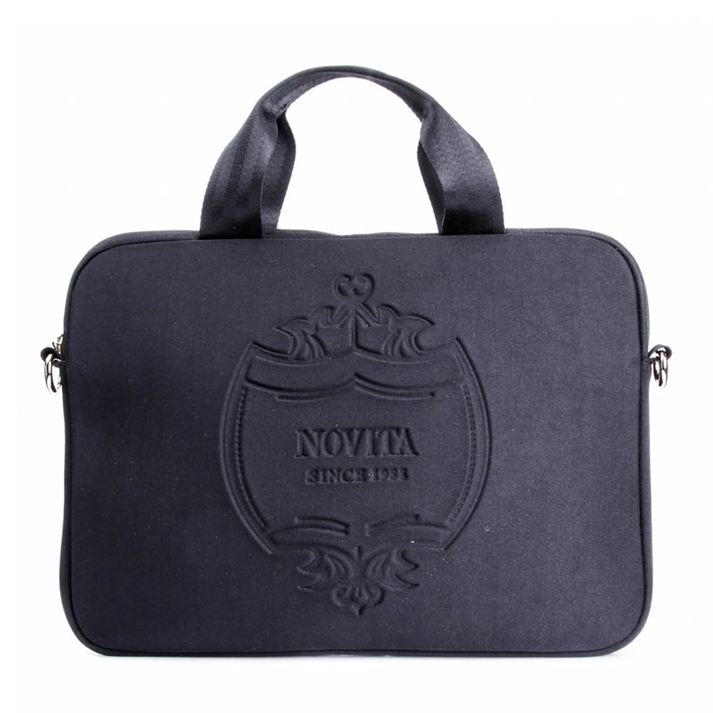 Favani, laptopväska från Novita i scubamaterial och handtag i nylon. Axelrem med karbinhakar i guldfärgad metall. Sobert präglad logo på utsidan av väskan. Väskan stängs med dragkedja, fack inuti väskan som stängs med kardborrelås. Mått : 34 x 26 x 2,5 (cm) Novita är varumärket med tidlösa, unika och omsorgsfullt tillverkade skor och accessoarer.