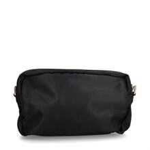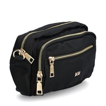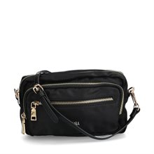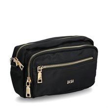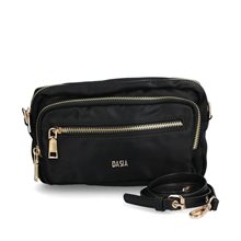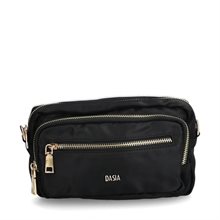 Axelremsväska i svart nylon från Dasia. Flera fack på utsidan som stängs med guldfärgade dragkedjor. Dasia-logga i guldfärgad metall på framsidan. Nylonfoder och 2 större fickor inuti, en av dem med dragkedja. Avtagbar tunn axelrem i svart pu, längden är reglerbar med hjälp av ett spänne. Storlek B: 22 H:14 D: 6 (cm)