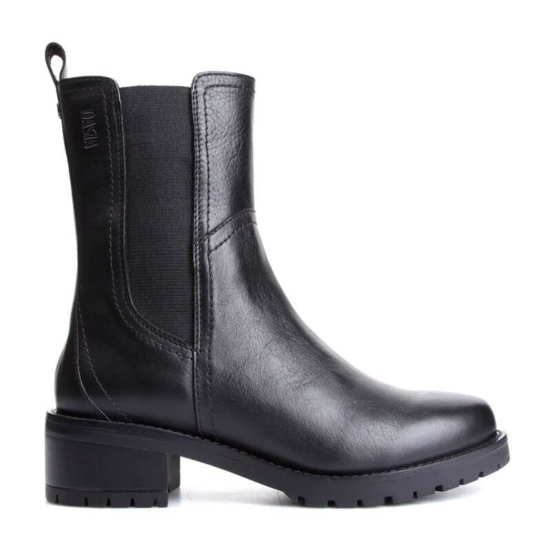 Bael, chelseaboots från Dasia i svart, LWG-certifierat skinn. Medelhögt skaft med elastik på utsidan och en dragkedja på insidan för lättare insteg, både praktiskt och trendigt. Fleecefodrade boots med mjuka uttagbara foaminnersulor, klädda med skinn. Grovtandade gummisulor ger bra grepp.