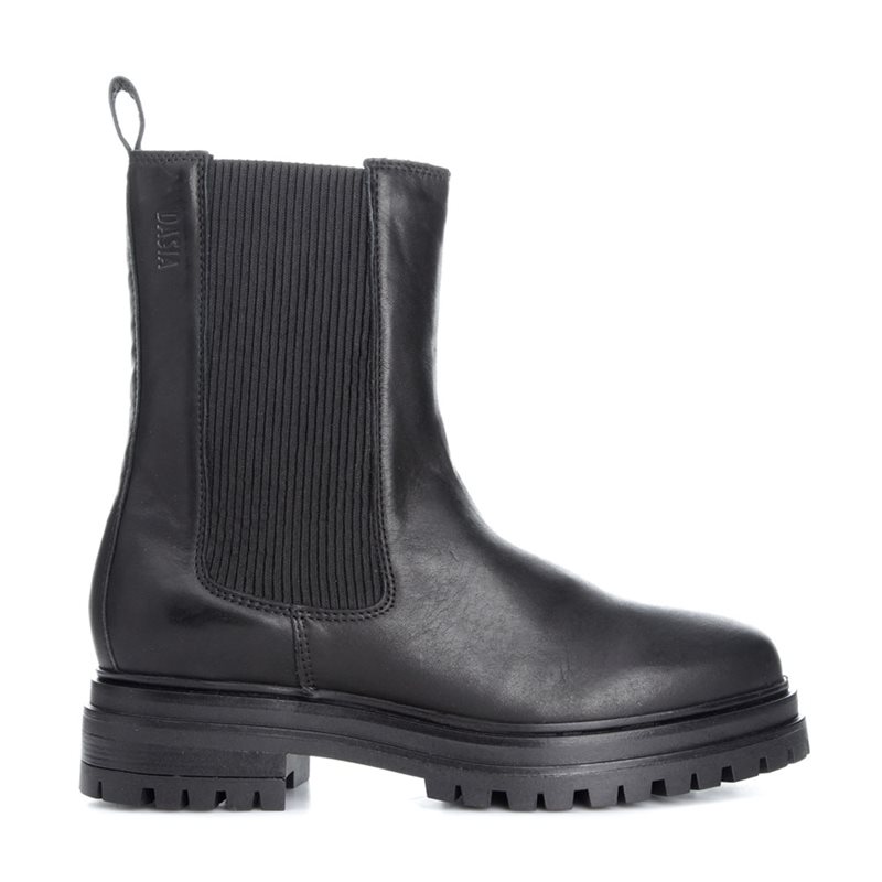 Cacao, chelseaboots från Dasia i en riktigt snygg modell! Ovandel i svart skinn, elastik på utsidan och praktisk dragkedja på insidan ger fin passform. Något högre skaft, ca 18 cm i stl 37. Grovt mönstrad sula i svart gummi ger skorna en kaxig attityd, men kängorna upplevs som ganska nätta tack vare den slimmade ovandelen. Tunnare fleecefoder.