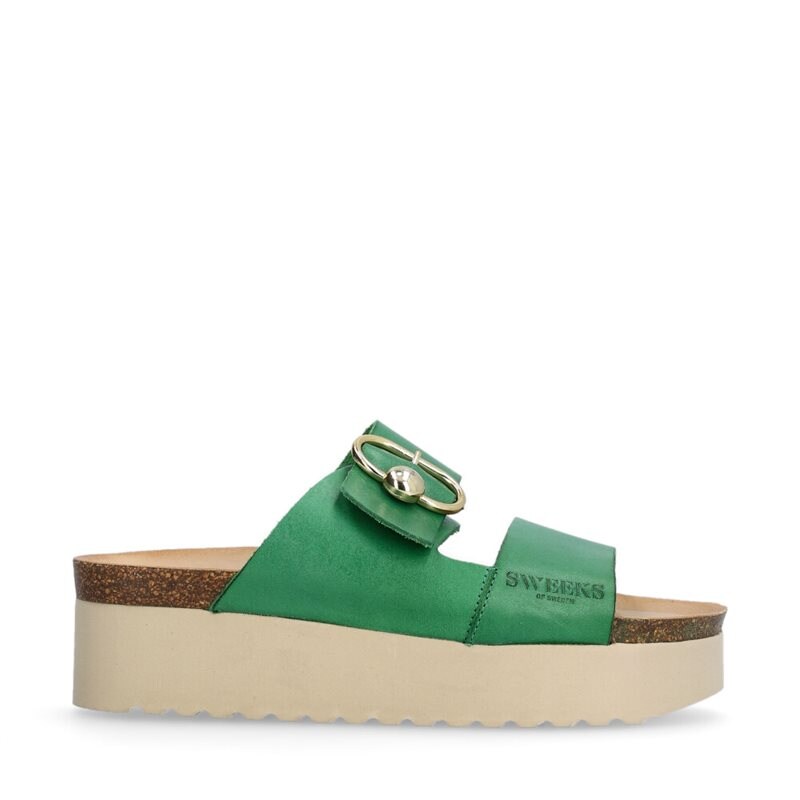 Hedda, sandaler från Sweeks. Slip-in sandaler med breda remmar i grönt skinn, varav den ena är justerbar med ett guldfärgat spänne. Den nätta ovandelen i tillsammans med den sportiga platåsulan i EVA och kork skapar ett trendigt uttryck. Innersula i beige skinn. Sweeks är märket som andas sommar och modellerna är designade för att passa både vardag och fest. De har en avslappnad look som passar till kjol, shorts och byxor. Tillverkade för hand i Spanien. Liten i storlek.