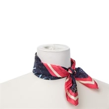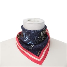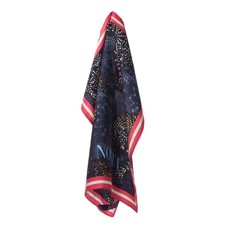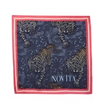 Cropani, fin scarf från Novita i 100% silke. Mönstrad med blå botten och tigrar i vitt, svart och gult, rödrosa kant runt hela scarfsen. Mått: 45 x 45 cm.