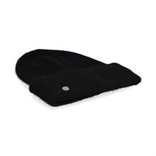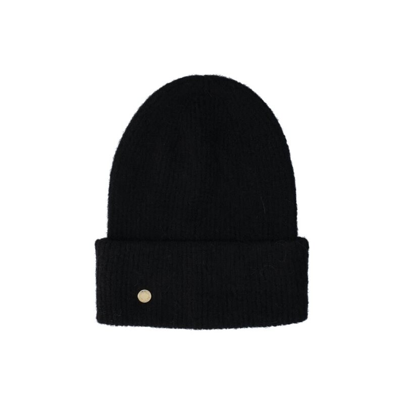 Brusino, ribbstickad mössa från Novita i svart ullmix, stickade i en garnblandning av 48% Baby Alpaca, 21% Ull, 28% Polyamid och 3% Elastan. Mössans höjd är ca 24 cm, med ett uppvik på ca 8 cm och har en dekorativ guldfärgad metallknapp med logo på sidan. Ett hantverk från Portugal med material godkända enligt RWS = Responsible Wool Standard Certified, samt innehåller återvunna material med Recycle Blended Certificate.