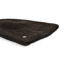 Lagolo, ribbstickad mössa från Novita i en mörkbrun melange, stickade i en garnblandning av 48% Baby Alpaca, 21% Ull, 28% Polyamid och 3% Elastan. Mössans höjd är ca 23 cm och har en dekorativ guldfärgad metallknapp med logo på sidan. Ett hantverk från Portugal med material godkända enligt RWS = Responsible Wool Standard Certified, samt innehåller återvunna material med Recycle Blended Certificate.
