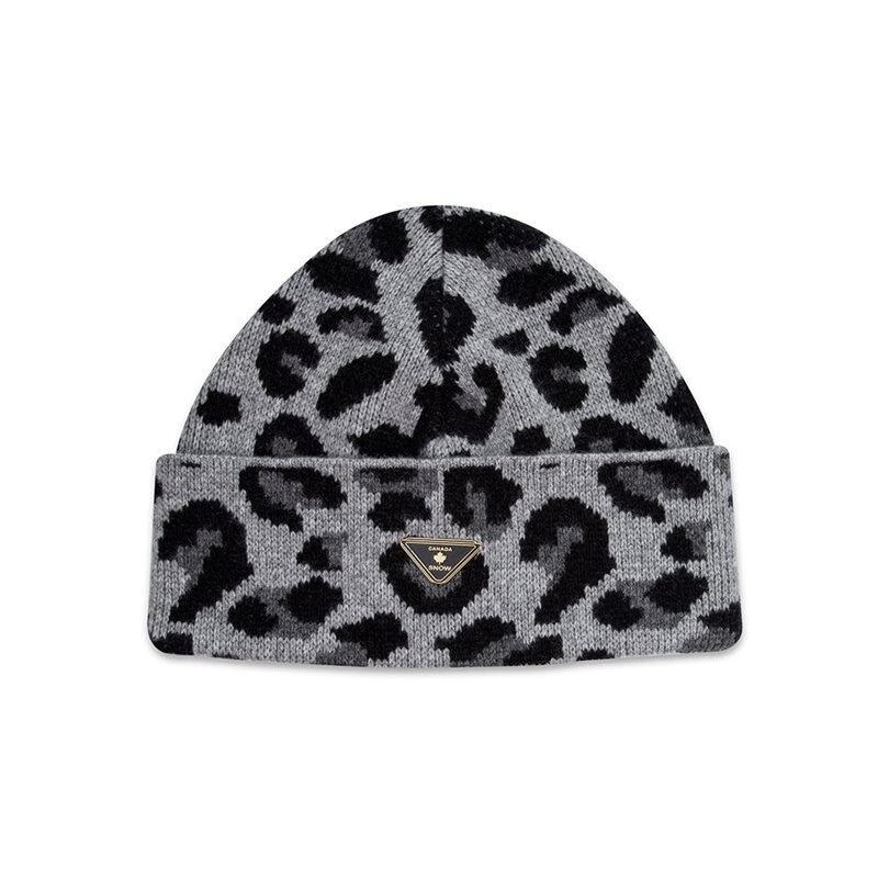 Leo, mössa i 100% lammull. Grå mössa med leopardmönster från Canada Snow med en liten logga i metall. Varm och skön mössa för kalla vinterdagar.