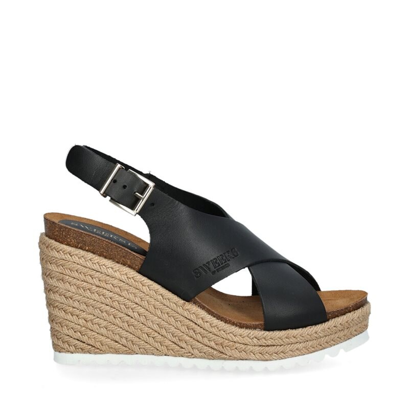Olivia, sandaletter från Sweeks. Ovandel med korslagda remmar i svart skinn. Vristremmen regleras med ett guldfärgat spänne, skorna har en skön innersula i mocka och kork. Kilklacken är klädd i flätad jute, vit räfflad sula undertill skapar ett trendigt och fräscht uttryck. Sweeks är märket som andas sommar, modellerna är designade för att passa både till vardag och fest. De har en avslappnad look som passar till kjol, shorts och byxor.