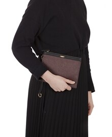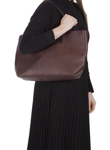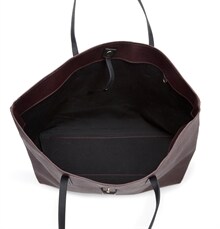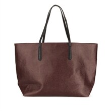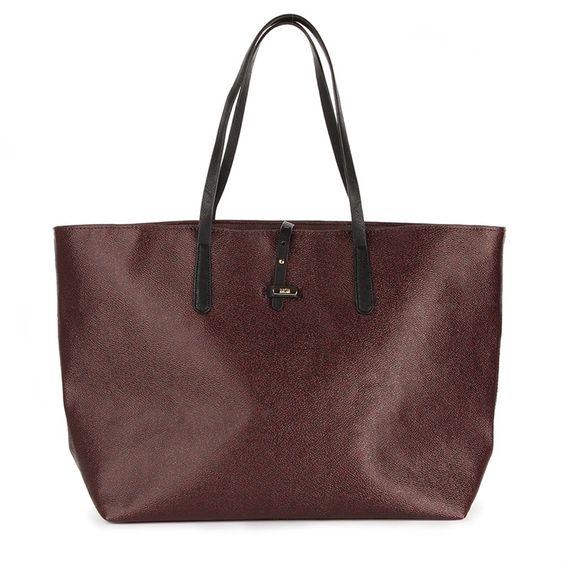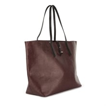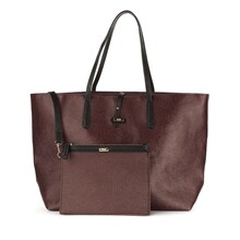 Shopper från Dasia i bordeaux läderimitation. Väskan har smala svarta axelremmar och en liten rem med tryckknapp så att man kan stänga till väskans öppning. Inuti så finns ytterligare en liten väska med dragkedja i samma printade material, den sitter fast i den stora väskan med en rem och en liten guldfärgad karbinhake. Denna lilla väska går att knäppa loss och användas som liten handväska. Mått, stora väskan: 47x28x14 cm. Lilla väskan 21x16x0,5 cm.