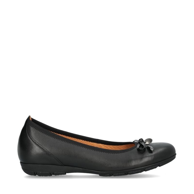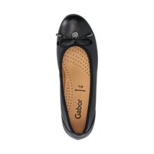 Bekväma ballerinaskor från Gabor. Ovandel i svart skinn mocka dekorativ rosett och metalldetaljer vid tån. Rundad tå. Innerfoder i textil för ökad komfort och kombineras med en innersula i skinn för optimalt fotklimat. Tunt räfflad yttersula i gummi som erbjuder både grepp och stabilitet.