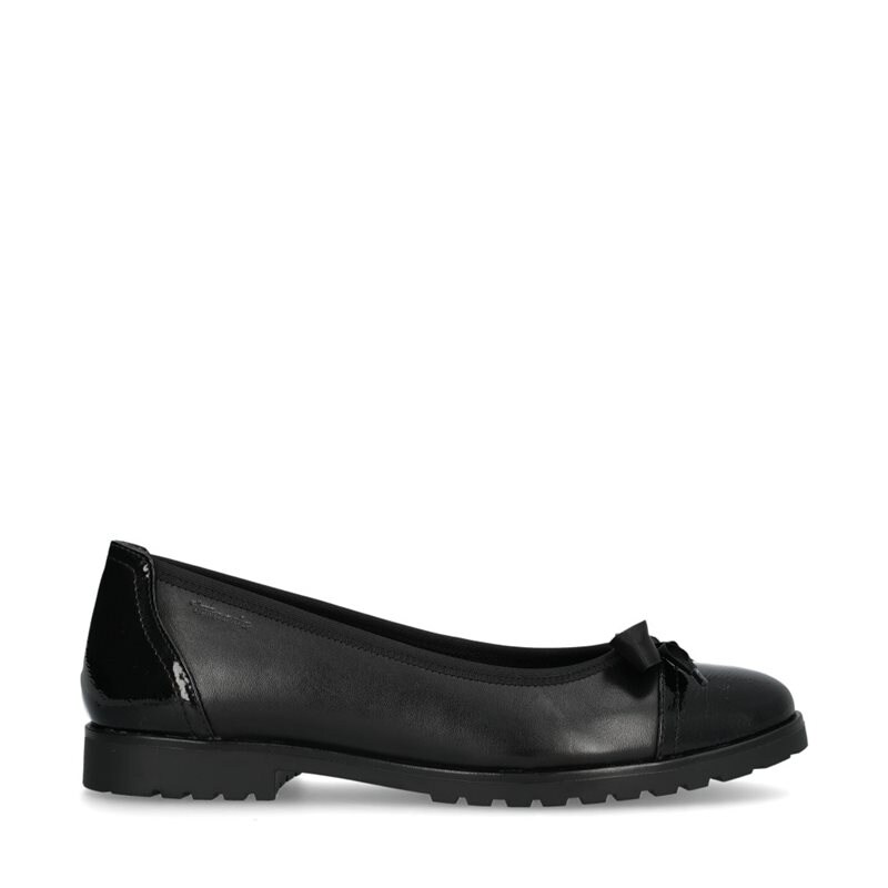Ballerinaskor från Tamaris. Ovandel i svart skinn med sofistikerade lack detaljer och dekorativ rosett vid tån. Innerfoder i textil som kombineras med en innersula i skinnimitation. Räfflad yttersula i gummi där klacken mäter 2,5 cm.
