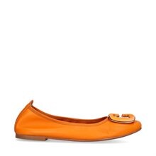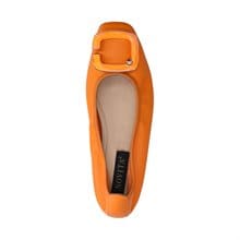 Amendola, ofodrad ballerina från Novita i mjukt, orange nappaläder med textilband runt kanten. Tunityttersula som är flexibel. Innersula av getskinn och med en 5 mm foam för komfort. Stort gummerat metallspänne. Liten klack på 1 cm av gummiblandning.