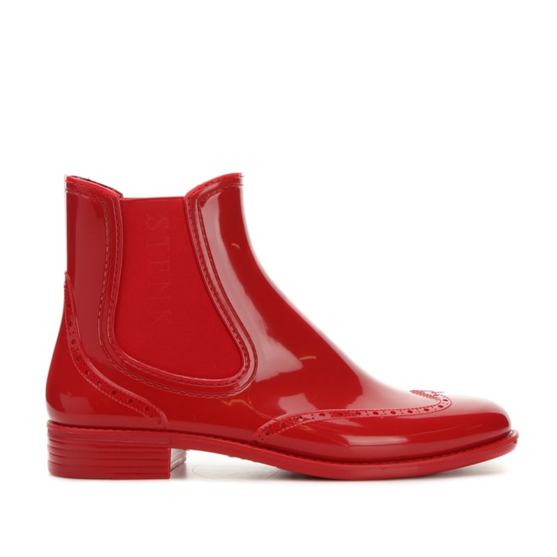 Ängaviken, regnboots från Stenk med en röd, blank yta och broguemönster. Elastik på båda sidor och en nätt och följsam passform. Vattentät gummistövel (ej elastik) i mjuk ftalatfri PVC, greppsäker yttersula i gummi. Uttagbar innersula i fleece och foder i bomullstextil. Rengör regelbundet stövlarna med ljummen tvållösning. Undvik lösningsmedel och att skrubba med en grov borste. Låt torka i rumstemperatur undvik kontakt med värmeelement. Använd en gumboot shine som skyddar mot uttorkning.