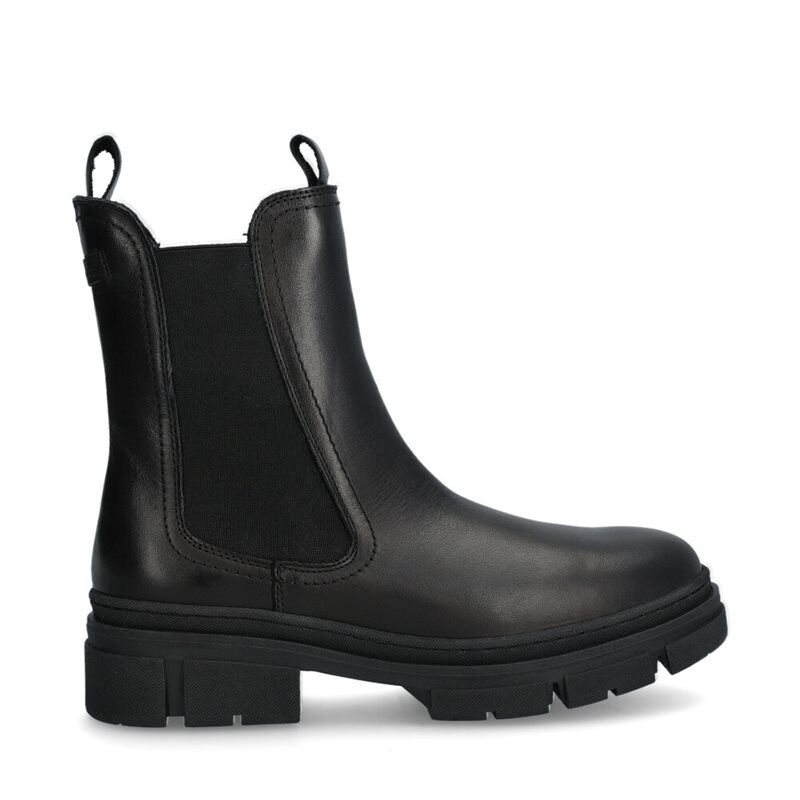 Chelseaboots från Tamaris i svart skinn kombinerar stil och funktionalitet. Elastiken på sidorna säkerställer en bekväm passform, och den grova, svarta yttersulan ger en tuff och modern look. Med en lägre platåsula och en klackhöjd på ca 5 cm får du en perfekt balans mellan höjd och komfort. Den rundade tån ger en snygg touch som kompletterar vilken outfit som helst.