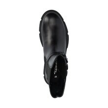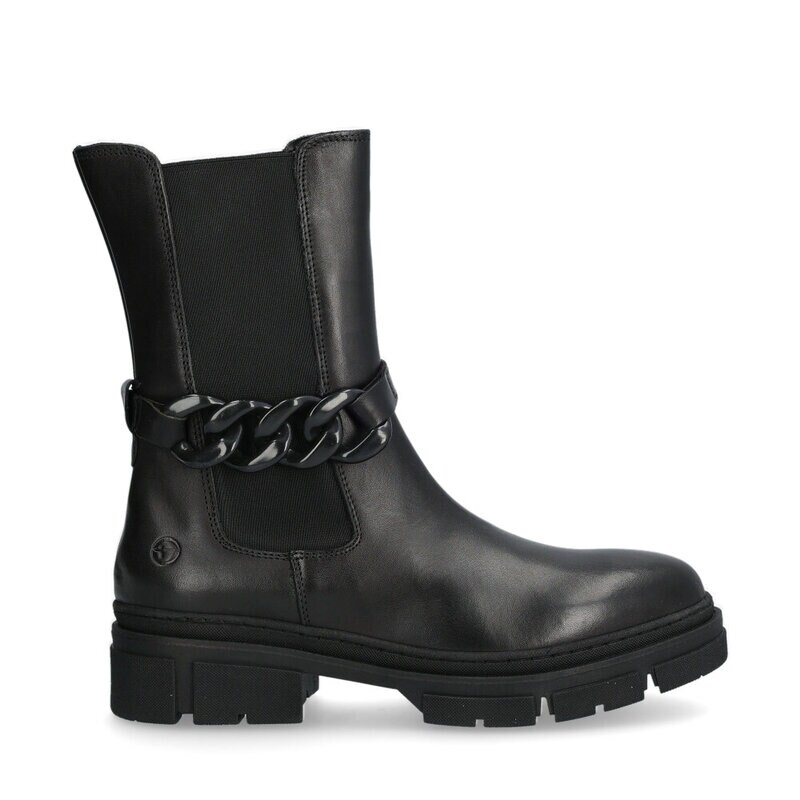 Chelseaboots från Tamaris i svart skinn med elastikpaneler på sidorna. Något högre modell med grova siulor i svart gummi. Svart kedja i blankt material på utsidan av skaftet blir en snygg detalj.
