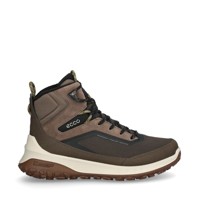 ULT-TRN, höga sneakers från ECCO i vattentät textil med gråa och bruna nubuck paneler, och greppvänlig gummisula från Michelin. Med snörlås justerar du snabbt passformen över foten. Sköna walkingskor med bra grepp och där du håller fötterna torra. Perfekta höga sneakers för längre promenader och trekking.