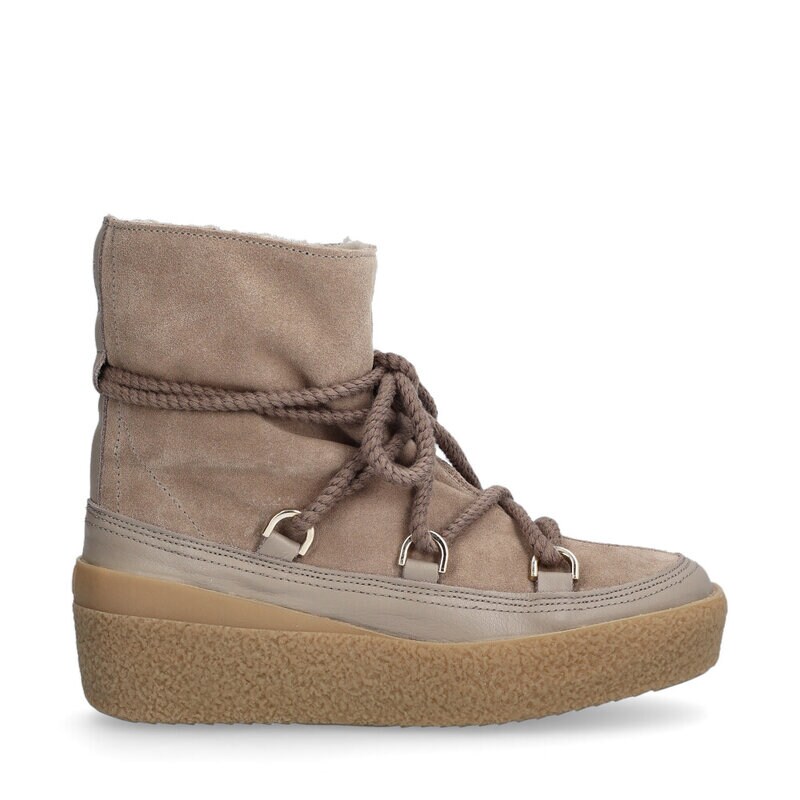 Ceder, boots från Daisa. Ovandel i beige, mjuk och fin mocka och skinnparti runt foten längs med sula och även på baksida skaft. Beige, grova bomullssnören över foten som snöras och knyts runt vristen. Guldfärgade d-rings och avslut i metall på snörena. Innersula och foder i mjuk, beige lammull håller foten varm. Kilformad sula i gummiblandning.
