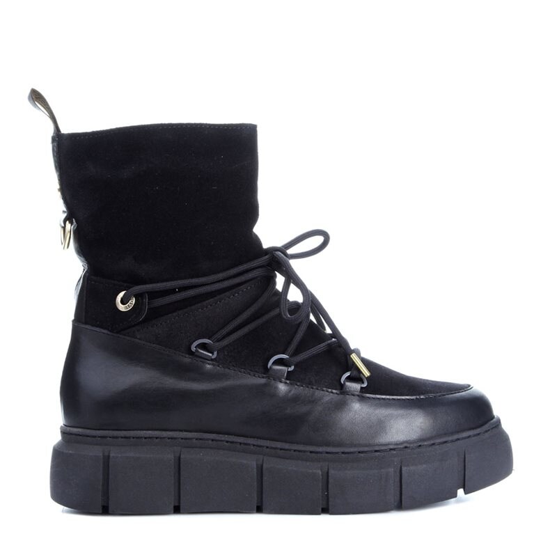 Cortina, varmfodrade boots från Novita. Ovandel i svart skinn runt foten och svart mocka i skaftet. Snörning fram som gör att man kan justera passformen något, YKK-dragkedja på insidan av skaftet. Fodrade med en mjuk pälsimitation, något kilformad högre sula. Varmfodrade, uttagbara innersulor. Varma och sköna boots för kalla dagar. .