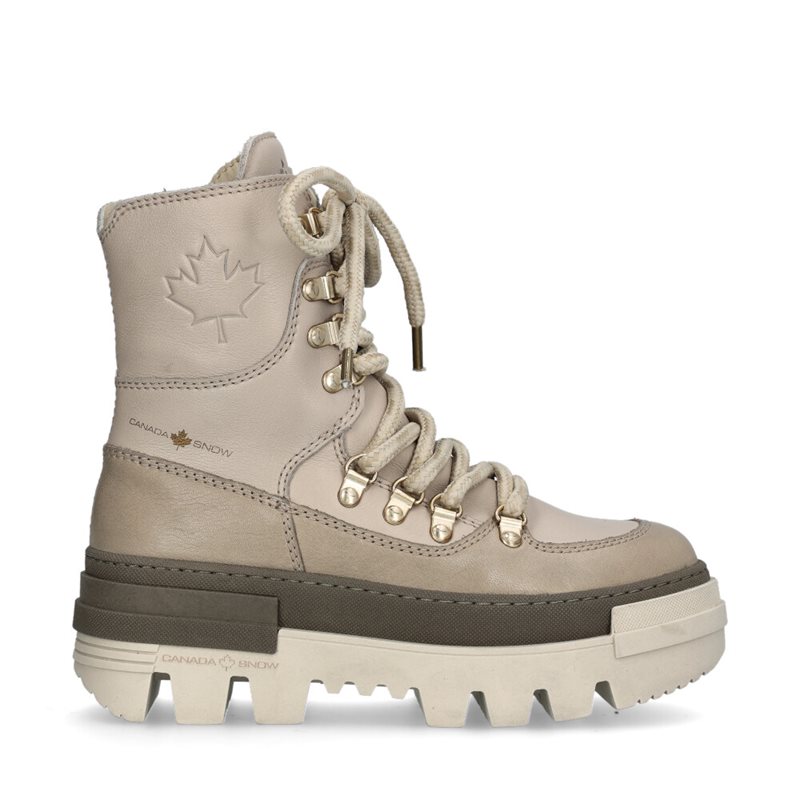 Canada Snow presenterar Mount Riz, varmfodrade kängor och robust räfflad yttersula. Beige ovandel i en mjuk mix an skinn och mocka, som kombineras med en praktisk dragkedja och snörning. Fodrade i en blandning av ull och textil för extra värme. Uttagbar innersula i latex som kombineras med en mellansula med tre värmeisolerade skikt såsom kork, aluminium och thinsulate. Grov yttersula i gummi för optimalt grepp.