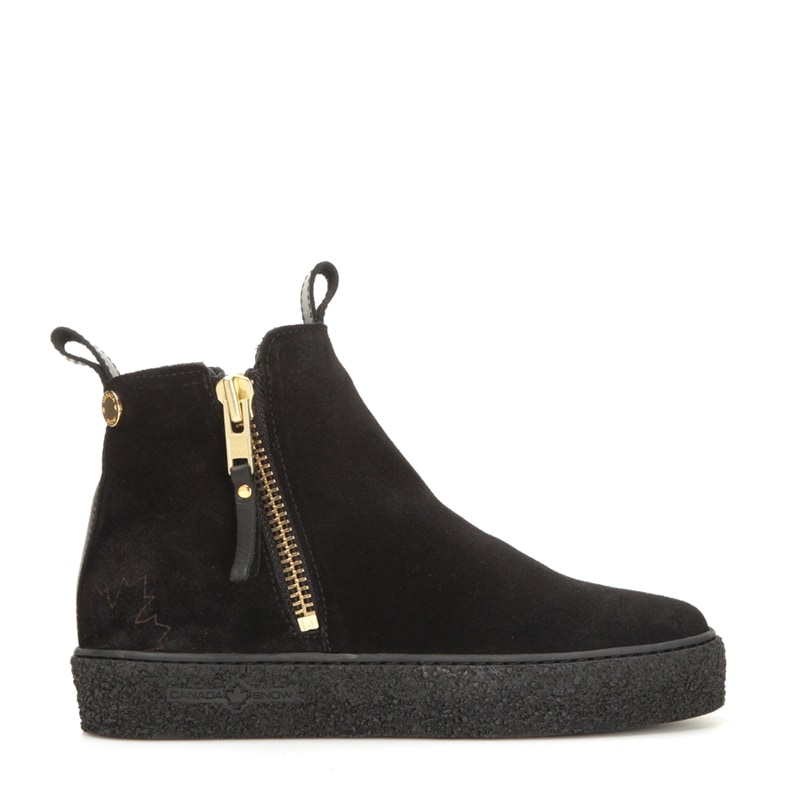 Mount Verm Zip, en klassiskt sportig boots från Canada Snow i mjuk svart mocka med vattenavvisande effekt. Guldfärgad, dekorativ dragkedja på utsidan och en funktionell dragkedja på insidan. Inuti skon finns en inbyggd kil på 3 mm för bästa komfort samt en komfortinnersula med flera värmeisolerande skikt. Foder i ullmix för god värmeisolering. Yttersulan är gjord i gummimix för extra god, mjuk komfort med crepe effekt och fina logodetaljer.