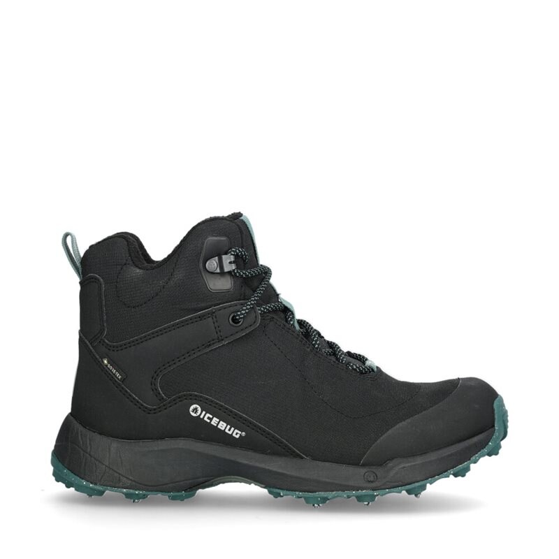 Pace3 BUGrip® från Icebug. Tillverkad med en ovandel i svart textil och tealfärgade detaljer i snörning och yttersula. Utrustad med ett vattentätt GORE-TEX®-membran så att dina fötter hålla sig torra varje användning. innefoder i textil och en yttersula i gummi med 16 BUGrip®-dubbar för optimalt grepp på snö, is och blöta underlag. Pace 3 är det perfekta valet för vandringen eller vardagspromenaden.