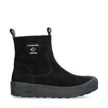 Quebec Grip, curlingboots från Canada Snow. Ovandel i svart mocka och ett dekorativt emblem med guldlöv på sidan. Behandlad mocka ger skon en vatten- och smutsavvisande yta. Kängan knäpps med YKK-dragkedja som gör det lätt att ta på sig skon. Bootsen är fodrade med fårskinn och den uttagbara innersulan är av äkta fårskinn och har flera värmeisolerande skikt som garanterat håller dig varm. Yttersulan i premiumigummi med partier av antislip samt glasfiber på undersidan ger extra bra grepp.