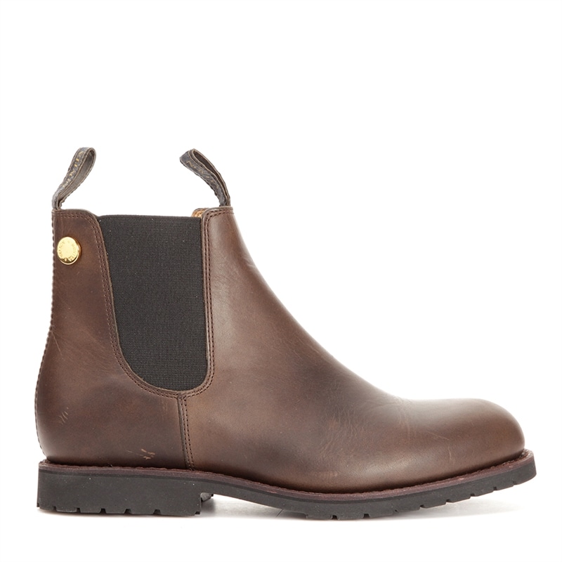 Grövre Chelseaboot i skinn med skinnfoder och Goodyearkonstruktion. En Goodyearkonstruktion är en avancerad tillverkningsprocess där ovanmaterial och bindsula sys med rand. Detta ger en längre livslängd och högre vattentålighet. Uppbyggd och paddad innersula för högre komfort. "Old-Gold"-färgad knapp på sidan. Textilögla fram- och baktill gör bootsen enklare att dra på.