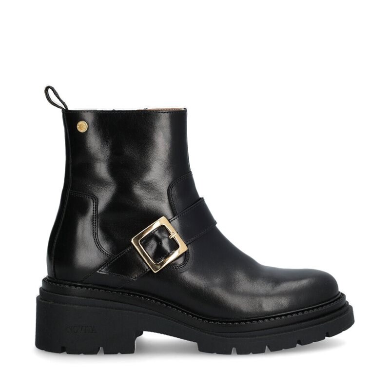 Savorini, boots från Novita. Ovandel i svart skinn med dragkedja på insidan av skaftet och rem med spänne över foten. Fodrade med kromfritt lammskinn. Bekväma o moderiktiga kängor med något kilformad sula och med en klackhöjd på ca 5 cm, skafthöjd ca 18 cm. Tillverkade i Portugal.