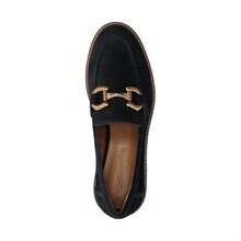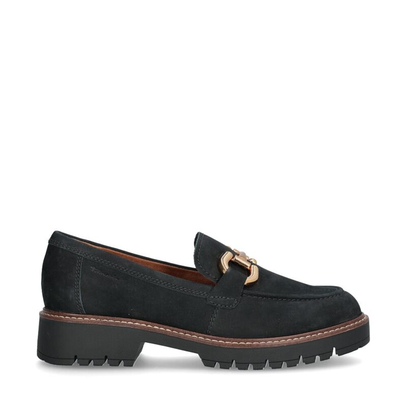 Upptäck den perfekta kombinationen av komfort och stil med loafers från Tamaris i mörkblå mocka. Den lyxiga guldfärgade spännet över foten tillför en touch av sofistikation, medan läderranden runt sulkanten ger skorna en exklusiv look. Dessa loafers är inte bara ett måste för varje modemedveten garderob, utan även ett par som kommer att hålla dig bekväm hela dagen.