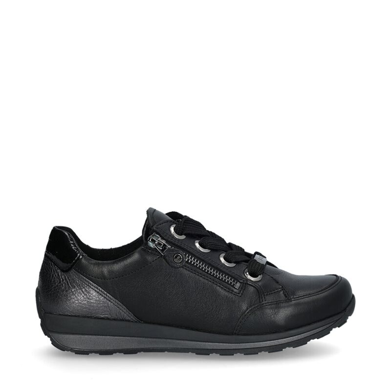 Sneakers från ARA med uttagbar innersula- Det svarta släta lädret i överdelen kommer att övertyga dig med sin höga kvalitet och ger denna damsko en stilfull design. Highsoft-funktionen är en unik och bekväm egenskap hos denna sko: ultramjukt läder anpassar sig perfekt till foten och förbättrar skons sportigt eleganta, design. Den skumbaserade SoftWalk-sulan vid fotvalvet erbjuder samtidigt mjuk dämpning, bekvämt stöd och flexibilitet. För att säkerställa att även större fötter har tillräckligt med utrymme har skon en generös passform. Den uttagbara fotbädden kan enkelt tas bort och ersättas med dina egna inlägg, vilket gör att skon kan anpassas efter dina personliga behov. Tack vare den justerbara snörningen och den praktiska dragkedjan lämnar komforten och den ergonomiska designen inget övrigt att önska.