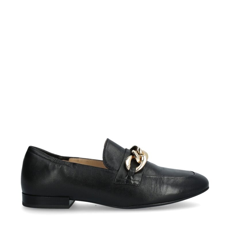Lyon, loafers från ARA i svart skinn med en bred guldfärgad kedja som omtag över foten. Foder i skinn och mjukt paddad innersula som ger fin komfort.
