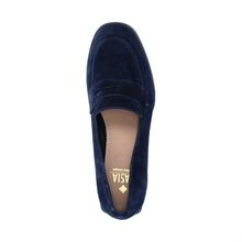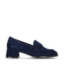 Celosia, pennyloafers från Dasia, i mörkblå mocka med klack, ca 4,5 cm hög. Rundad tå, fodrade med skinn och mjuk innersula.