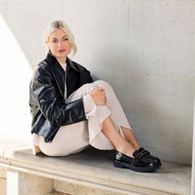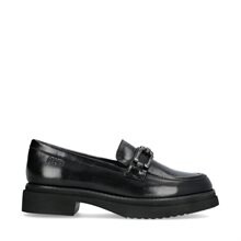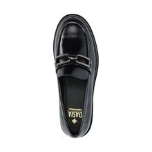 Chelone, loafers från Dasia i blankt, svart skinn. Dekorativt mörkgrått metallspänne på remmen över foten. Något grövre yttersula i lättviktsmaterial ger ett modernt uttryck utan att kompromissa med komforten. Med foder i skinn och en mjukt vadderad innersula erbjuder Chelone en utmärkt kombination av stil och bekvämlighet.