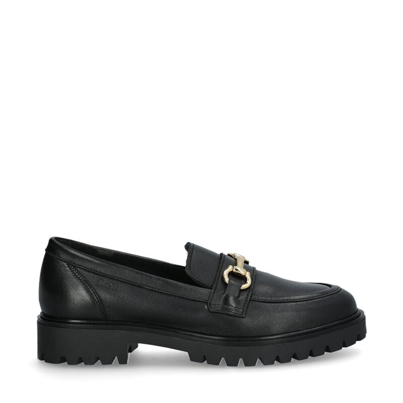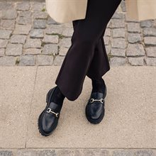 Lita, loafers från Dasia i svart skinn med guldfärgad detalj över foten. Fodrade i mjukt skinn och har mjuk uppbyggd innersula i skinn för skön komfort. Flexibel yttersula i svart gummiblandning med grovtandat mönster.