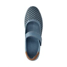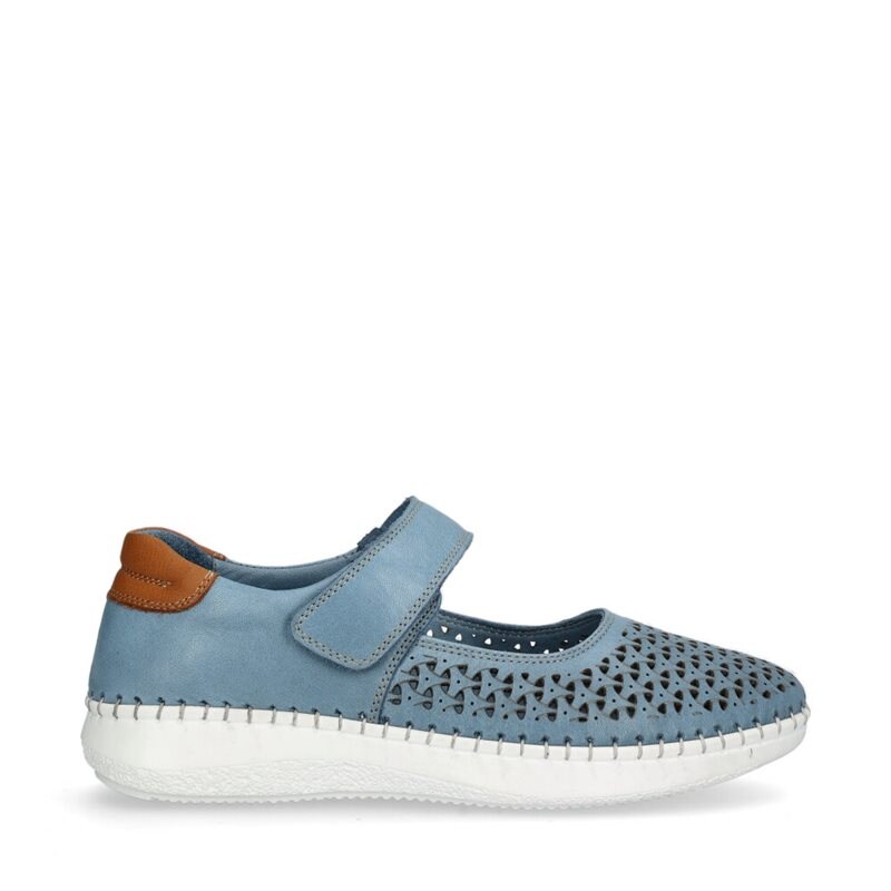 Mapel, ballerina från Dasia. Luftiga och sköna skor i ett mjukt blått skinn med laserskuret mönster över tån, som både är dekorativt och gör att foten andas. Vristrem med kardborre för bästa komfort och lätt att ta på sig. Fodrad med mjukt skinn och skon har en mjuk uttagbar innersula. Flexibel vit yttersula.