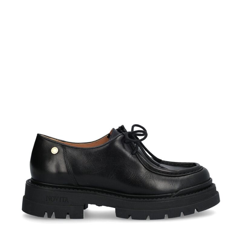 Moricone, lågskor från Novita i svart skinn med mockasinsöm över tån. Fodrade med mjukt, kromfritt lammläder med bekväm innersula. Grov yttersula i svart gummi. Hantverk från Portugal.