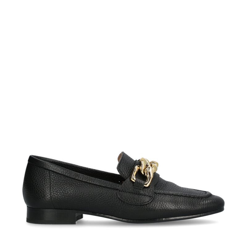 Sinzano, loafers från Novita. Ofodrade skor i svart, tumlat skinn med innersula i ljust skinn. Bred, dekorativ guldfärgad kedja på omtaget över foten. Låg, bekväm klackhöjd och yttersula i gummi.