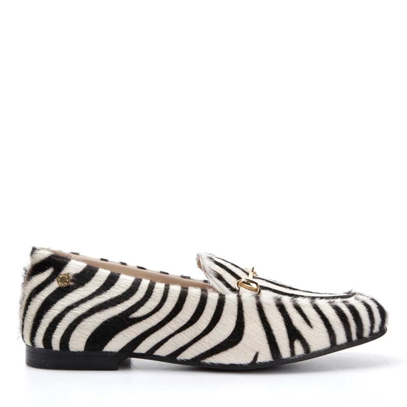 Velletri, loafers från Novita i zebrarandigt skinn med päls och ett guldfärgat metallspänne. Innersula och foder i ljust, mjukt getskinn. Yttersula i mjukt gummi framtill samt på klack och neolit. Novita är tidlösa, unika och omsorgsfullt tillverkade skor av finaste skinn från utvalda garverier.
