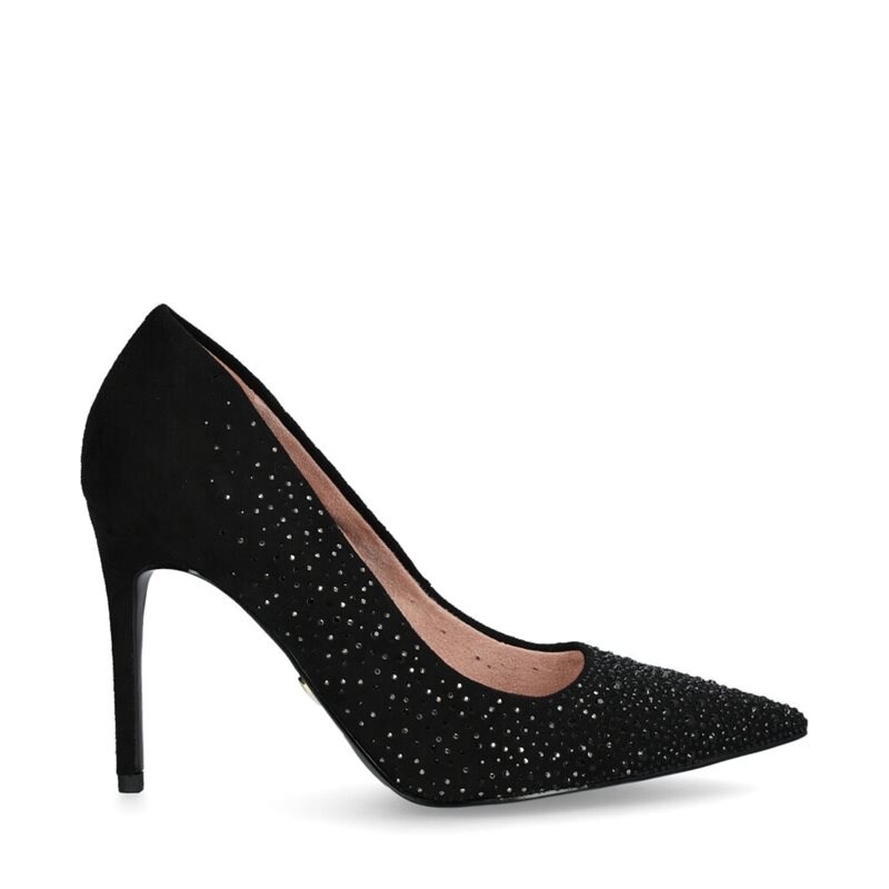 Pumps från Tamaris i svart textil med svarta glänsande stenar. Stilettklack, ca 10 cm hög. Innersula, som är uttagbar, som ger komfort så att du kan bära skorna hela dagen.