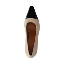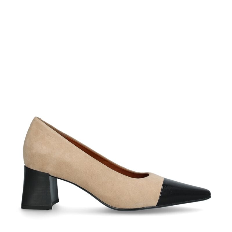 Altea, pumps från Vagabond Shoemakers. Tillverkade i beige mocka och med en tåhätta i svart lackat skinn skapar de en sofistikerad kontrast. Skinn/textilfoder och innersula i skinn ger maximal komfort. Den spetsiga tåformen och den breda blockklacken, ca 6 cm hög, ger dessa pumps en distinkt och modern utstrålning.