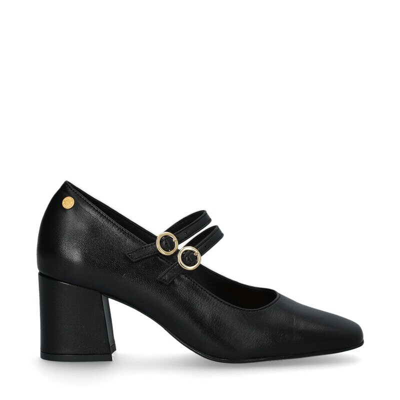 Barletta, pumps från Novita i svart nappaskinn med foder i kromfritt lammskinn. Pumpsen har rak tå och läderklädd blockklack, ca 6,5 cm hög samt två smala remmar över foten som knäpps med runda, guldfärgade spännen. Ytterrsula i tunit. Något rymligare läst, passar dig med lite bredare fötter.