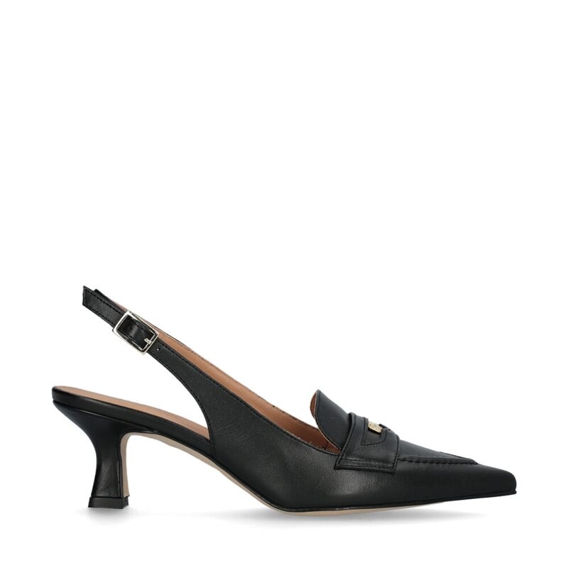 Labate, slingbacks från Novita i svart skinn med spetsig tå och smal rem runt vristen som knäpps med metallspänne. Bekväm klack ca 5,5 cm hög.
