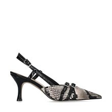 Novara från Novita Gold Collection - läcker pumps i ormmönstrat skinn i svart och vit. Remmarna är i napplackskinn. Rektangulära silverfärgade spännen som dekorativ detalj. Innefoder och innersula i skinn för optimal komfort. Den klädda klacken mäter 7,5 cm.