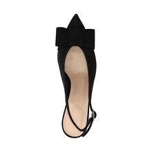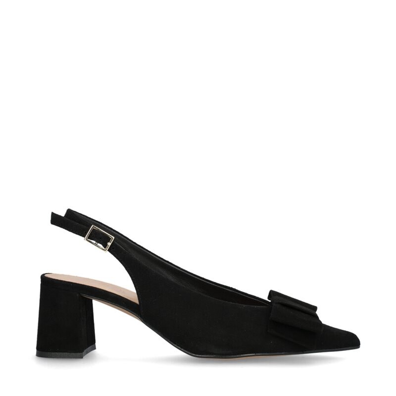 Rivoli slingback pumps från Novita Gold Collection. Ovandel i svart getmocka med snygg dekorativ rosett över den spetsiga tån. Skinnfoder och kläddklack som mäter 6 cm.