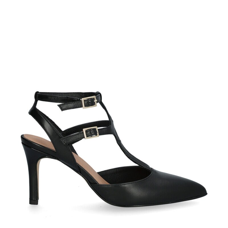 San Dana, pumps från Novita i svart nappaläder. Stängd tå och smala remmar över och runt foten som knäpps med guldfärgade spännen. Foder och innersula i skinn. Yttersula i tunit, klackhöjd ca 8 cm. Mycket snygga och feminina pumps.