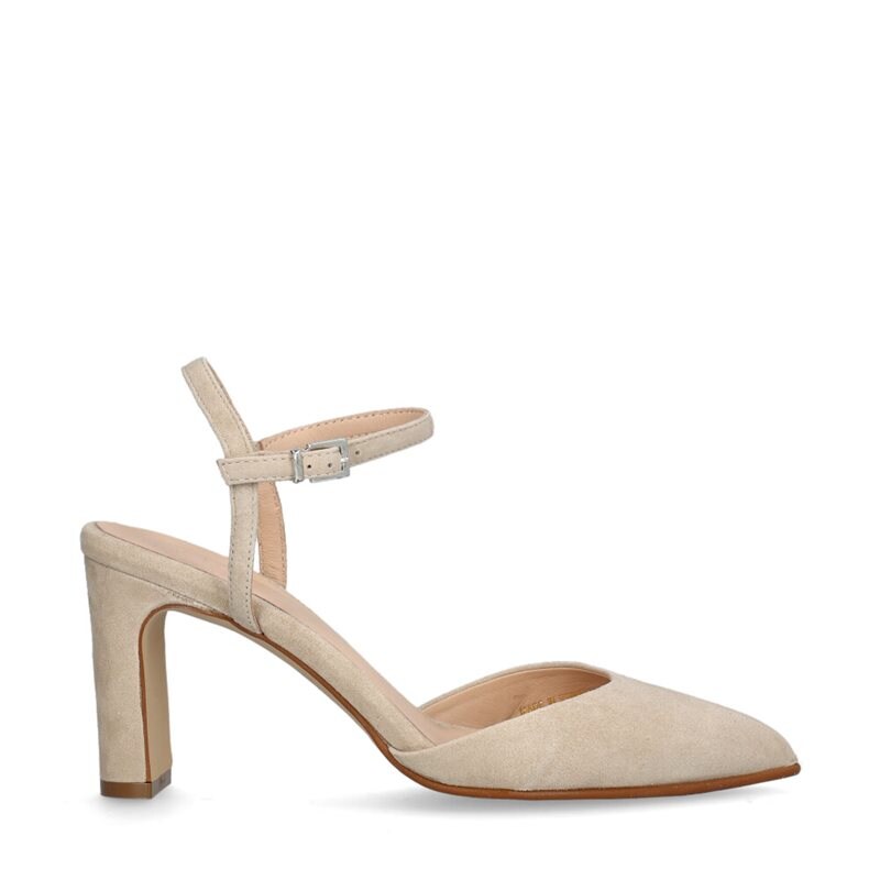 Novita Villini pumps slingback beige, med stängd tå och en vristrem. Naturvitt nappaläder på ovandelen och getläder som foder. Silverspänne på vristremmen. Tunitsula. Klädd klack på 8 cm.