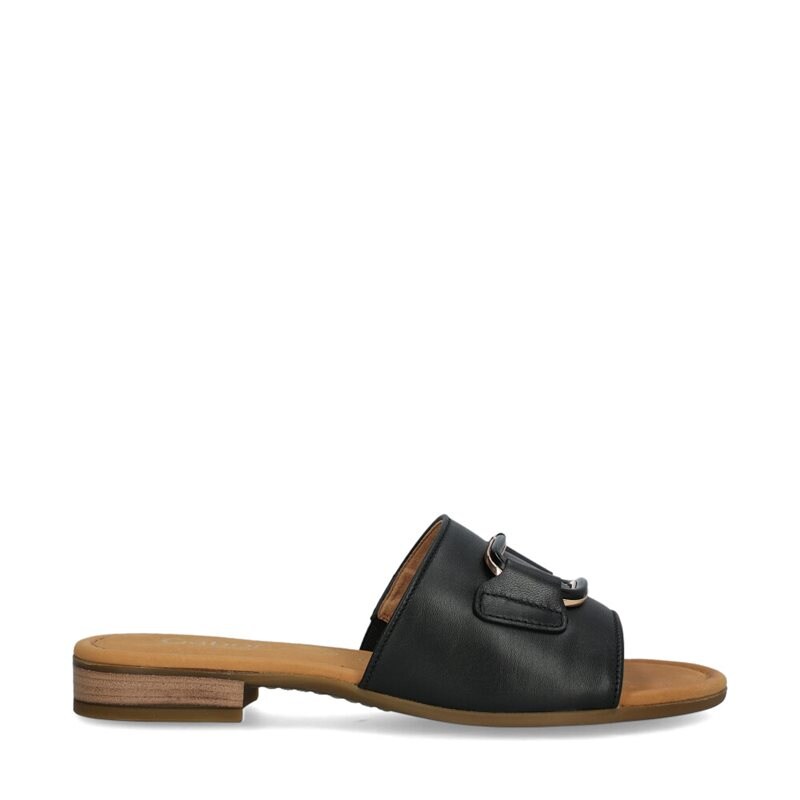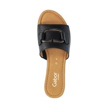 Sandaler från Gabor i svart skinn med svart och guldfärgad dekoration över foten. Låg klack ca 2 cm hög.