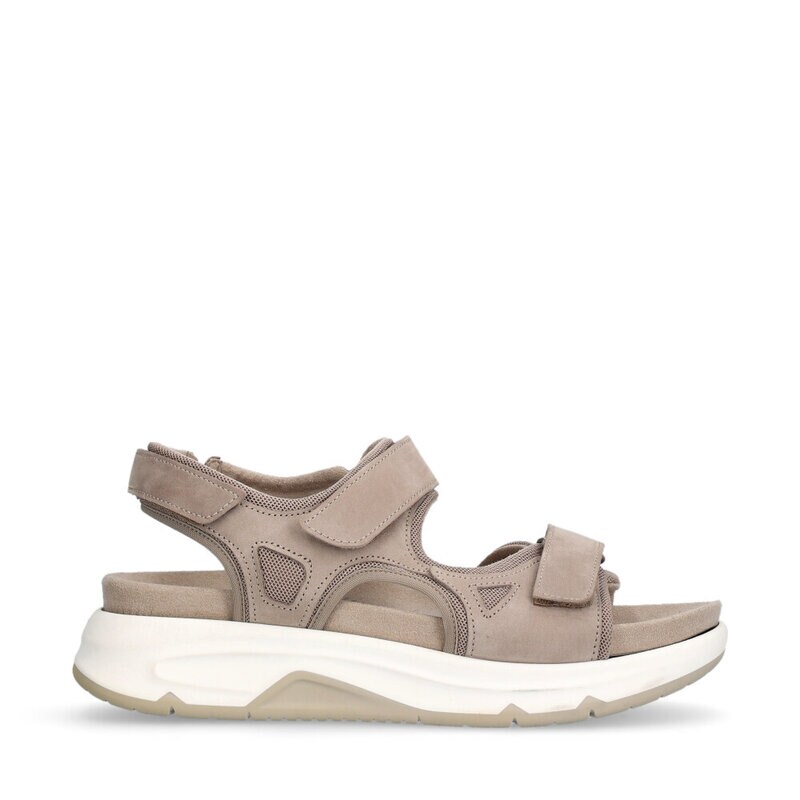 Remsandaler från Gabor i beige nubuck med tre justerbara remmar över och runt foten. Fodrade med textil och microfleece. Rolling Soft-yttersulor som ger en bekväm gåmg.