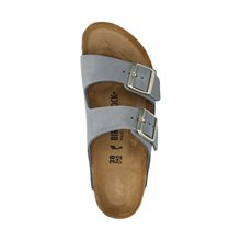 Arizona, klassisk modell från Birkenstock. Ovandel i ljusblå nubuck med två justerbara remmar för att enkelt kunna anpassa passformen. Mockaklädd korkfotbädd. Fotbäddens utformning ger dig maximalt stöd och avlastning för knän och rygg. Smal läst, fin passform för dig med normala eller smalare fötter.