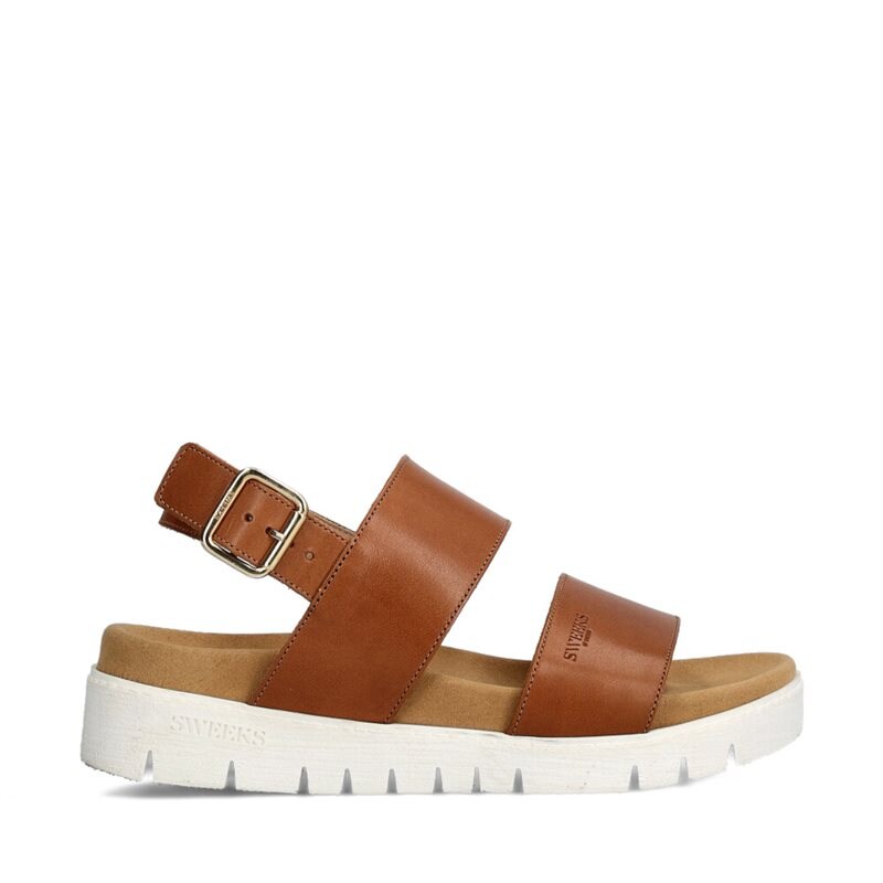 Gabriela, sandaler från Sweeks med två breda remmar i cognacsfärgat skinn över foten. Hälrem som justeras med metallspänne. Anatomiskt utformad läst för att bli riktigt bekväma sandaler, innersulan klädd med mjuk microfleece. Flexibel yttersula i vitt lättviktsgummi. Handtillverkade i Portugal.